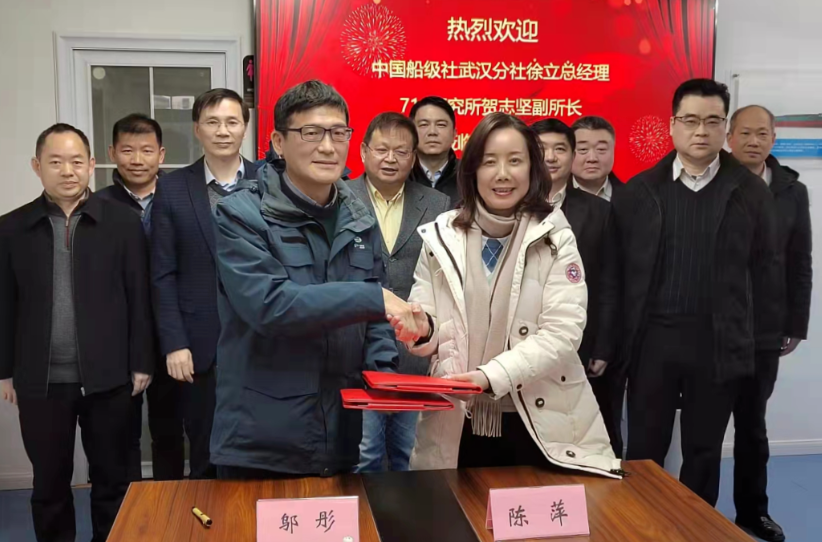 中國船級社武漢分社總經(jīng)理徐立、創(chuàng)新江海和創(chuàng)遠(yuǎn)海運董事長袁厚安、七一一所副所長賀志堅等共同參加簽約儀式。