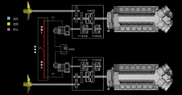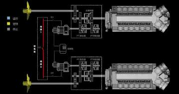 “海巡06”船主動力系統采用七一一所自主研發的柴電混合動力控制系統,配有智能化PTO/PTI切換控制裝置,便于船員切換進入一機雙槳模式,即其中一舷的主機在驅動螺旋槳同時驅動軸帶電機發電(運行在PTO模式),通過配電板供電給另一舷軸帶電機(運行在PTI模式)驅動螺旋槳。這樣的設計有利于在船舶低速航行時提高主機負荷,降低主機的燃油消耗率,降低碳排放,提高經濟性。