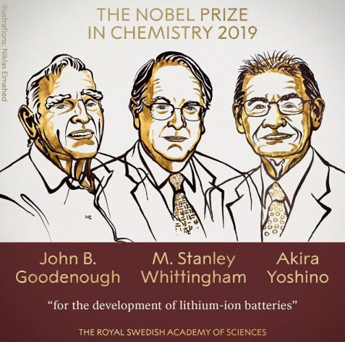 2019年諾貝爾化學獎授予John B. Goodenough, M. Stanley Whittingham, Akira Yoshino,以表彰他們在鋰電池領域的貢獻。
