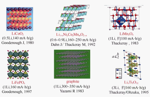 商業鋰離子電池正負極材料的示意圖、主要發明人、發明時間
