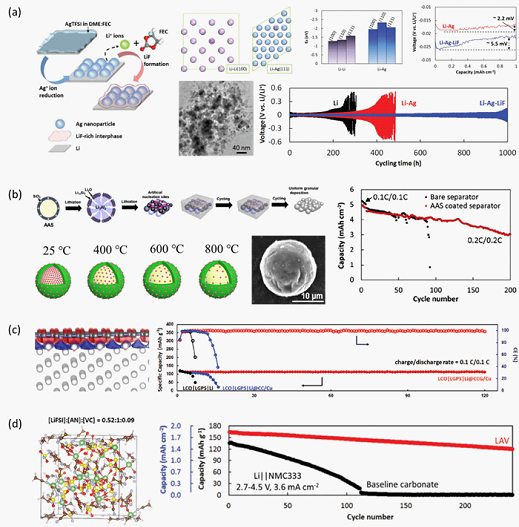圖1 基于(a)銀-氟化鋰人工界面,(b)富LixAl位點鋁基宿主結構和(c)少層石墨烯-三維儲鋰結構的鋰金屬負極保護;(d)對鋰穩定的新型腈類電解液