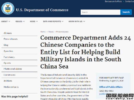 8月26日,美國商務部網站發布新聞稿稱,商務部產業安全局將24家中國企業列入美國實體清單,原因是這些企業“幫助中國軍方在南海修建人工島”。
