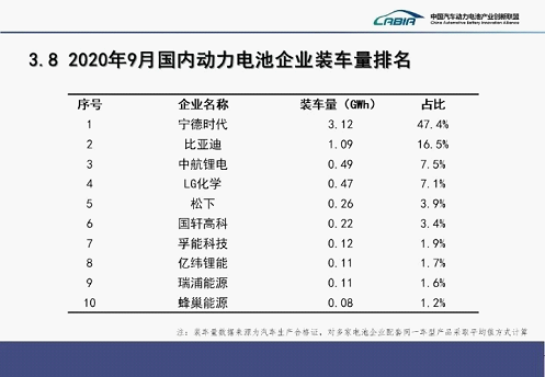 企業集中度水平,2020年9月,我國新能源汽車市場共計51家動力電池企業實現裝車配套,較8月份增加7家。排名前3家、前5家、前10家動力電池企業動力電池裝車量分別為4.7GWh、5.4GWh和6.1GWh,占總裝車量比分別為71.4%、82.4%和92.2%。