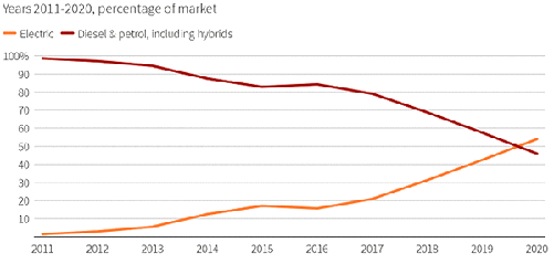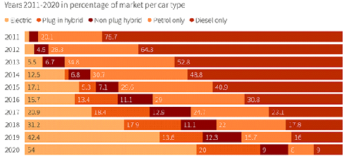 如果一個國家真的想推廣電動車,其實也很容易,把乘用車的油價提高一點就可以了。事實上,還真有國家這么做了,就是挪威。作為歐洲最注重環保理念的國家之一,挪威雖然是個產油大國,是世界第七大和西歐最大的石油生產國,但是,挪威卻擁有著全球最高的油價。當前,挪威汽油價格在16元/升左右,為全球之最。正是在高額的油價倒逼下,即使位于高緯寒冷地帶,挪威人普遍選擇購買純電動車型。近日,據挪威公路聯合會(OFV)周二發布的數據,2020年該國電動車銷量占全市場比例達到54.3%,成為全世界首個全年電動車銷量占比過半的國家。短短十年間,電動車在挪威的市占率從區區1%上升至超越半數,高油價和高純電動車補貼功不可沒。從具體數據來看,挪威2020年總共銷售了141,412輛新車,其中76,789輛為純電動車。