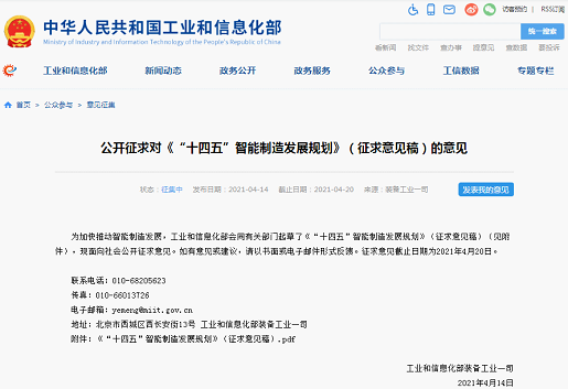 為加快推動智能制造發展,工業和信息化部會同有關部門起草了《“十四五”智能制造發展規劃》(征求意見稿)(見附件),面向社會公開征求意見。征求意見截止日期為2021年4月20日。