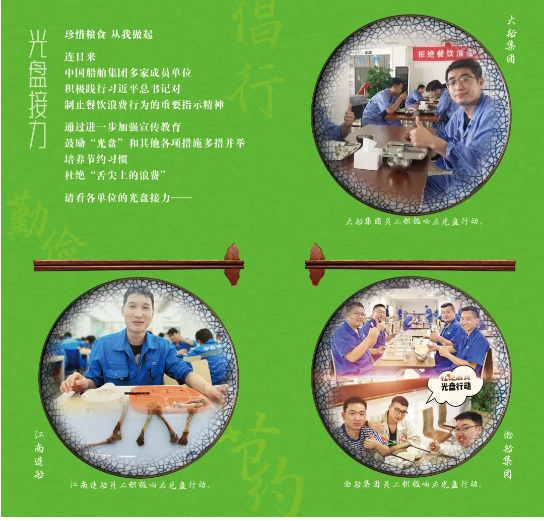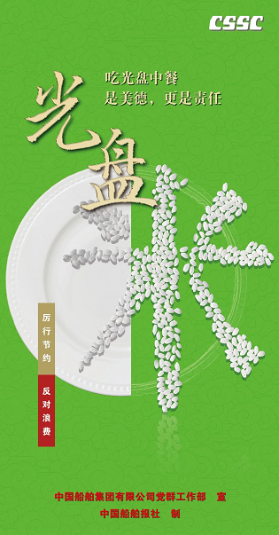 為認真貫徹落實習(xí)近平總書記關(guān)于制止餐飲浪費行為的重要指示精神,大力弘揚中華民族勤儉節(jié)約、珍惜糧食的文明用餐習(xí)慣,中國船舶集團積極開展“制止餐飲浪費 踐行光盤行動”專項宣傳引導(dǎo)活動。