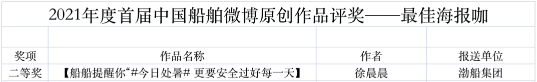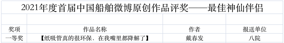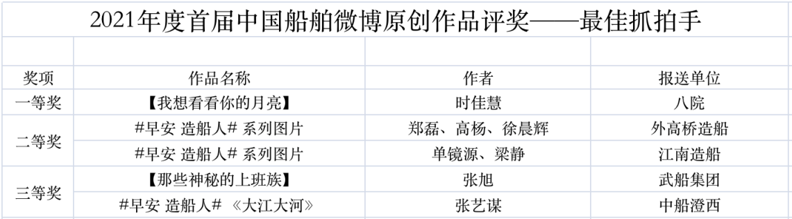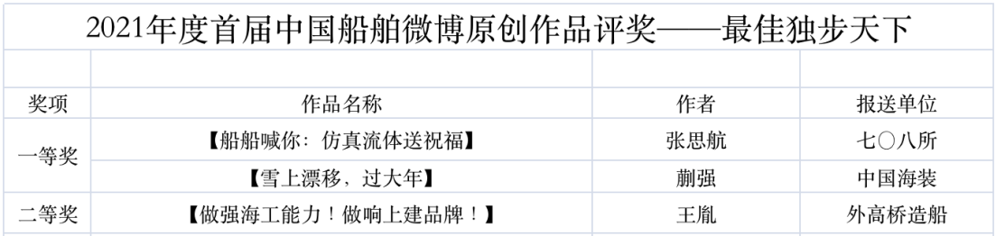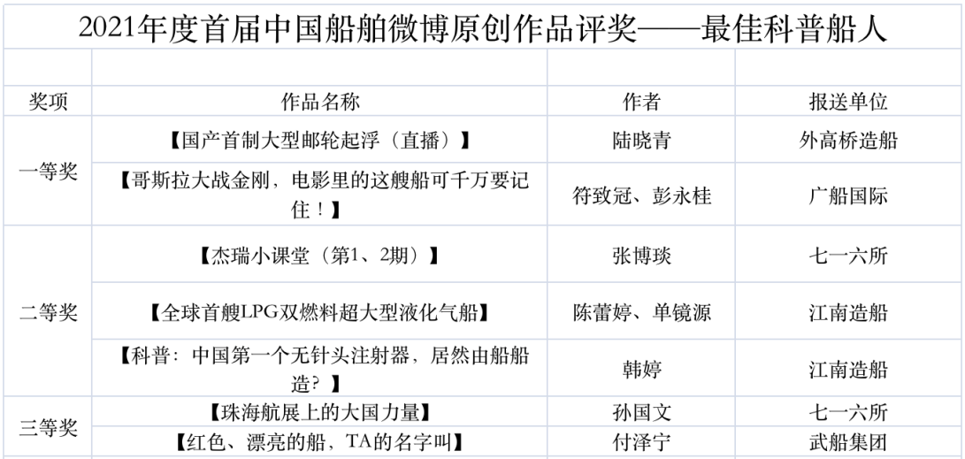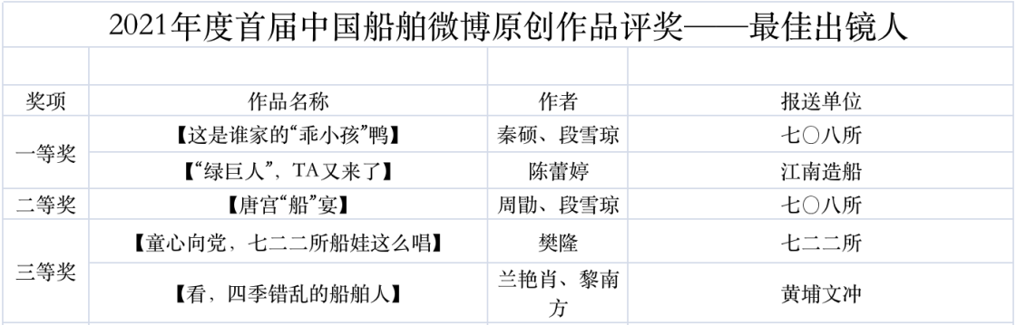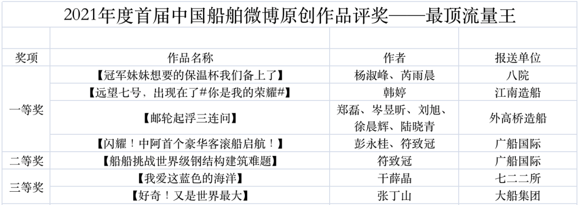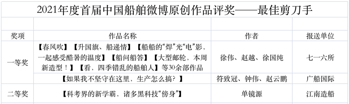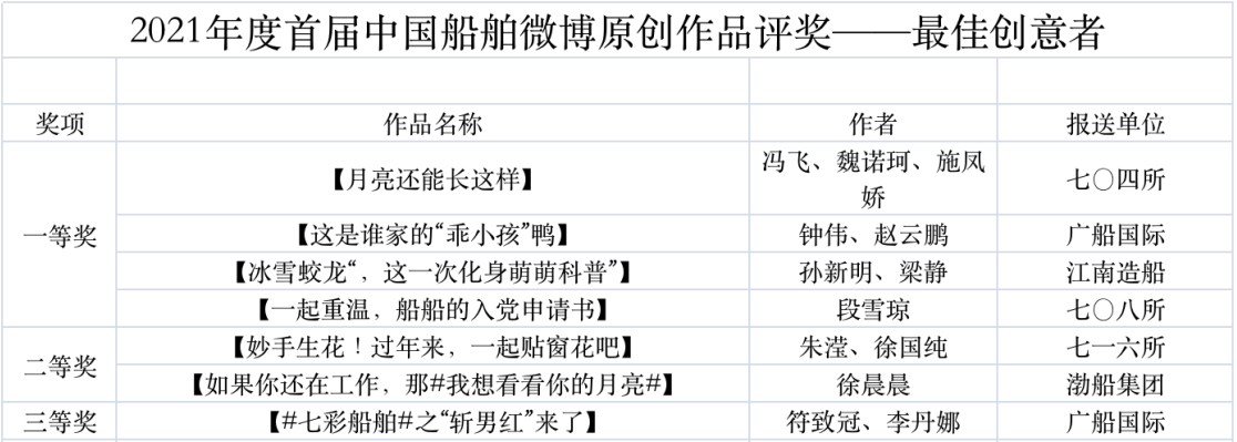 為鼓勵(lì)更多成員單位積極加入到中國(guó)船舶集團(tuán)新媒體平臺(tái)的宣傳中來(lái),在集團(tuán)公司黨群工作部的指導(dǎo)下,中國(guó)船舶報(bào)社從不同維度,對(duì)2021年度各單位支持“中國(guó)船舶”微信的力度進(jìn)行了梳理統(tǒng)計(jì),并利用微博政務(wù)的全國(guó)專家?guī)煸u(píng)審資源,對(duì)2021年度“中國(guó)船舶”微博原創(chuàng)作品進(jìn)行了專業(yè)評(píng)審,評(píng)選結(jié)果公布如下: