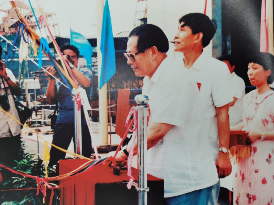 1986年,江澤民同志為江南造船65000噸原油輪“柳河”號下水剪彩。