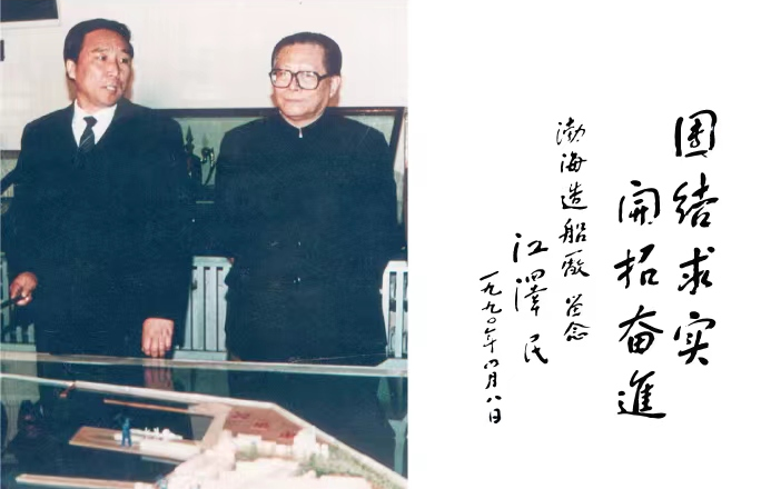 1990 年4月8日,江澤民同志視察渤海造船廠并題詞“團結(jié)求實,開拓奮進(jìn)”。