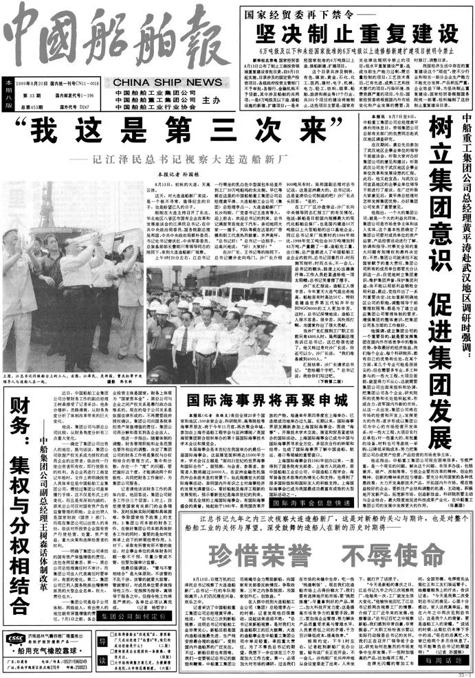 1999年8月20日,《中國船舶報》報道江澤民同志第三次視察大船集團。
