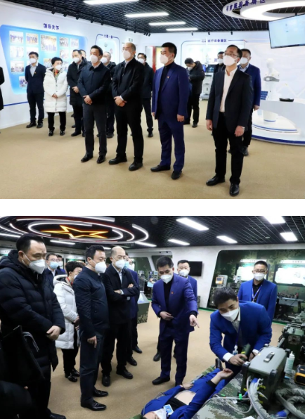 譚作鈞一行參觀了中國船舶集團旗下中船海神醫(yī)療科技有限公司應(yīng)急醫(yī)療救援裝備展廳,觀摩了公司自主研制的便攜式通用生命支持系統(tǒng)模擬急救現(xiàn)場演示,詳細(xì)了解了有關(guān)產(chǎn)品的技術(shù)研發(fā)、性能指標(biāo)、應(yīng)用場景和生產(chǎn)保供能力等情況。