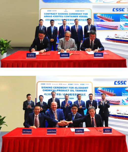 此次展會上,集團公司有關成員單位負責人率隊赴展會開展重點船海項目經營洽談并拜訪當地和周邊國家主要客戶。集團公司以“高端綠色、領跑未來”為參展主題,展臺設置了集團總體區(qū)、高端綠色船舶區(qū)、先進動力配套區(qū)共3個展示區(qū)域,重點展示了首艘國產大型郵輪、27.1萬立方米超大型LNG(液化天然氣)運輸船、10800車LNG雙燃料汽車運輸船、全球首艘LNG雙燃料VLCC(超大型油船)、21萬噸氨燃料散貨船、9.3萬立方米超大型全冷式液化氣船等一系列技術含量高、全球競爭力強的高端綠色船型,以及CPGC-WinGD 10X92DF-M甲醇雙燃料發(fā)動機、船用供氣系統、船用碳捕捉系統、船舶新能源動力系統解決方案等滿足IMO(國際海事組織)當前和未來排放要求的先進動力配套設備,充分彰顯了中國船舶集團的國際化品牌形象及引領國際船舶市場創(chuàng)新發(fā)展的澎湃動力。