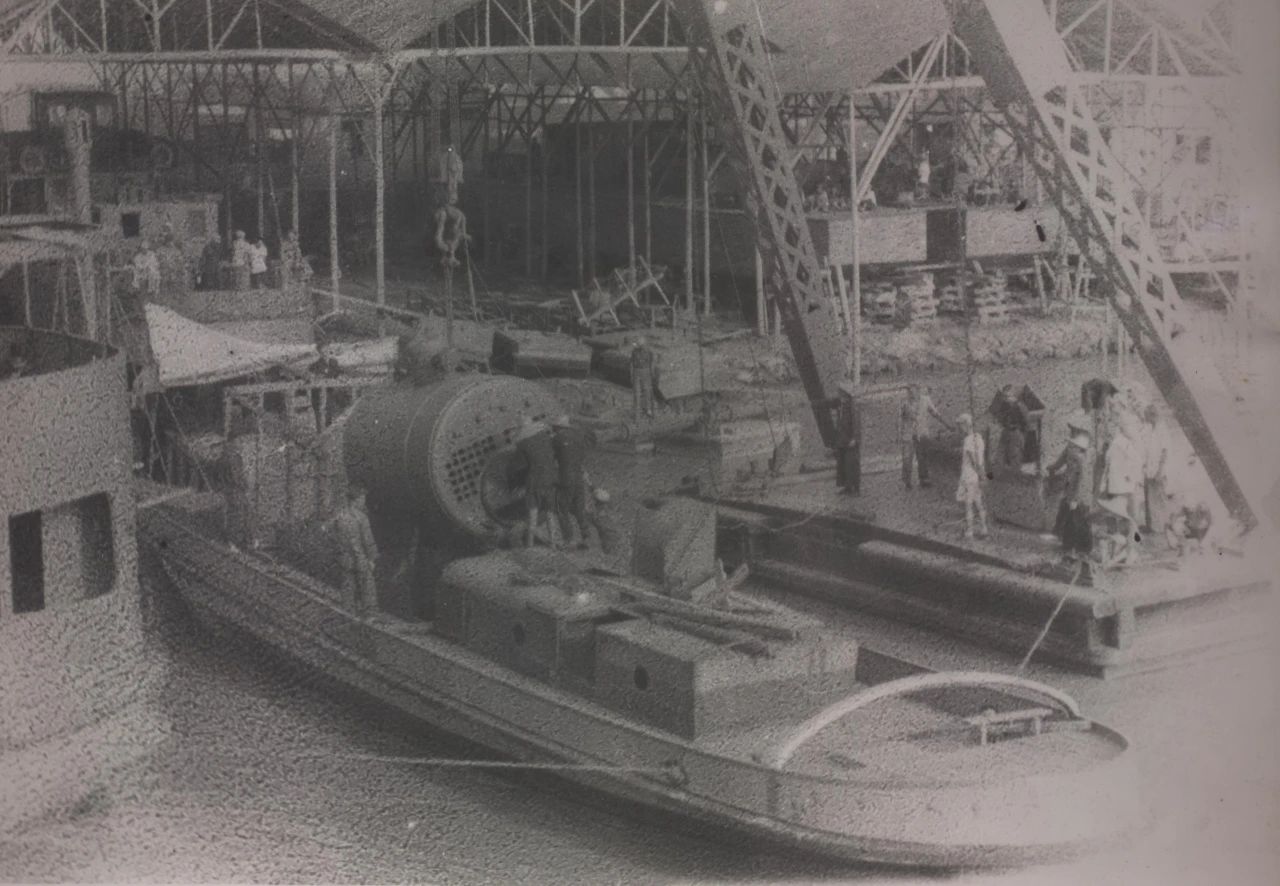 1934年武漢,上世紀30年代,武昌造船成立之初,工人們以手工作業“敲敲打打”形式開展修造船業務。修造的船只大多為100~300噸、鋼肋骨與木殼結構,僅有少量是鋼鉚接船體。建造的船只只能在長江上航行跑跑運輸。為了生存和救國,船廠還建造一些農用機械器具、槍支,以輔助民生、支援抗日。