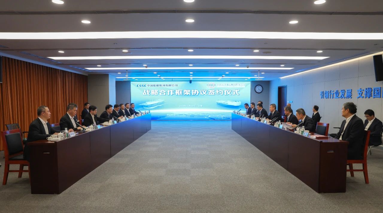10月15日,中國船舶集團(tuán)有限公司與中國遠(yuǎn)洋海運(yùn)集團(tuán)有限公司在上海簽訂戰(zhàn)略合作框架協(xié)議。中國船舶集團(tuán)黨組書記、董事長溫剛,中遠(yuǎn)海運(yùn)集團(tuán)黨組書記、董事長萬敏,黨組副書記、總經(jīng)理朱碧新出席簽約儀式。中國船舶集團(tuán)黨組成員、副總經(jīng)理盛紀(jì)綱,紀(jì)檢監(jiān)察組組長、黨組成員彭宏,中遠(yuǎn)海運(yùn)集團(tuán)黨組成員、副總經(jīng)理、總會計師孫云飛出席簽約儀式。盛紀(jì)綱和孫云飛分別代表雙方在協(xié)議上簽字。簽約前,雙方就進(jìn)一步加強(qiáng)溝通交流、深化多領(lǐng)域合作進(jìn)行了交流探討。